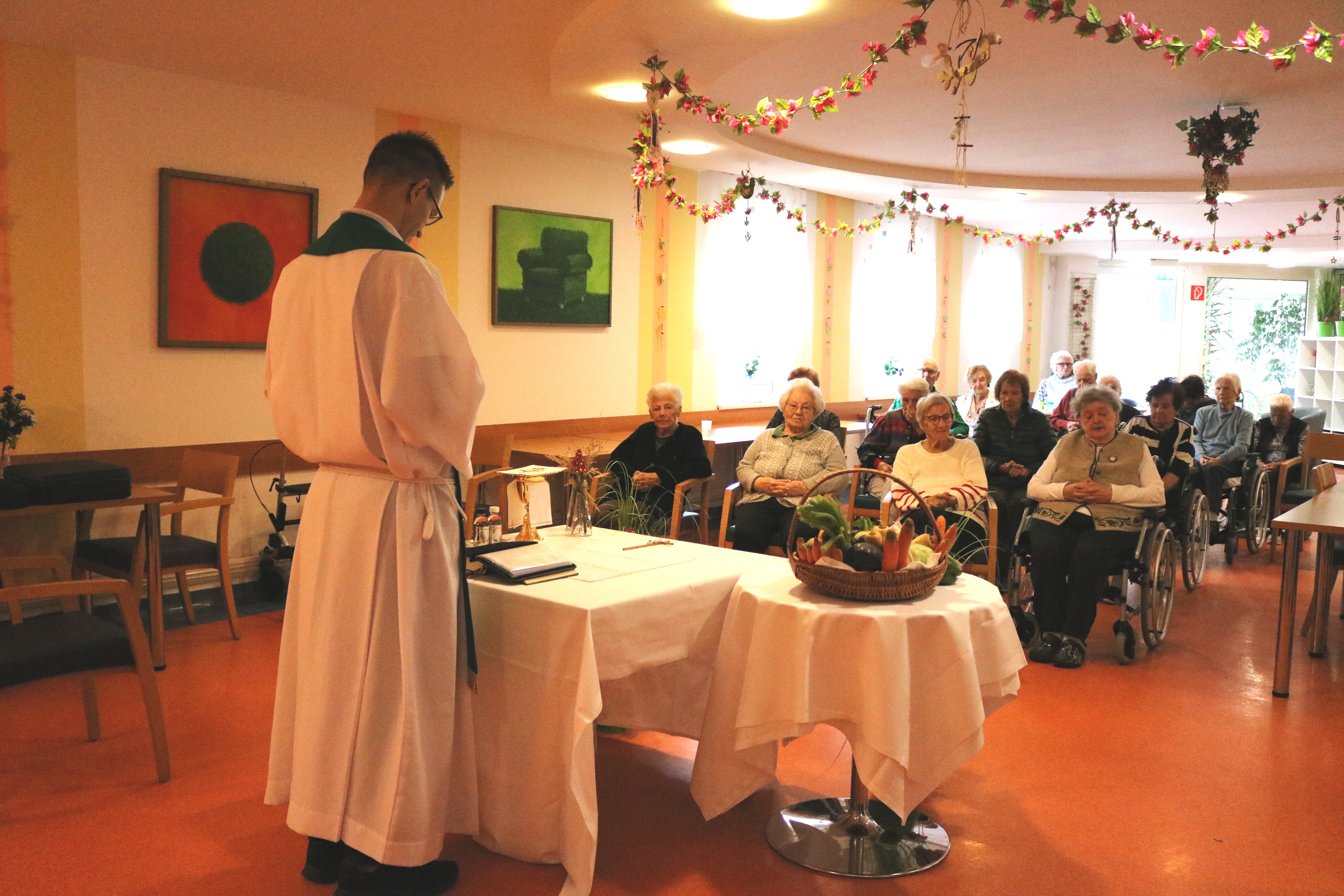 Das Erntedankfest ist eine Tradition, die in vielen Kulturen gefeiert wird, um die Fülle der Ernte zu würdigen und Dankbarkeit für die gesammelten Gaben auszudrücken. Besonders die Seniorinnen und Senioren des Hauses legen großen Wert darauf, da sie es aus Kinder- und Jugendtagen gewohnt waren, sich für die Ernte zu bedanken. Ein reichlich gefüllter Erntedankkorb stand zur Segnung bereit. So fanden sich die Bewohner:innen sowie Mitarbeiter:innen im Speisesaal zu einem Erntedankgottesdienst zusammen, den der Herr Kaplan Simon von der Katholischen Kirche führte.
