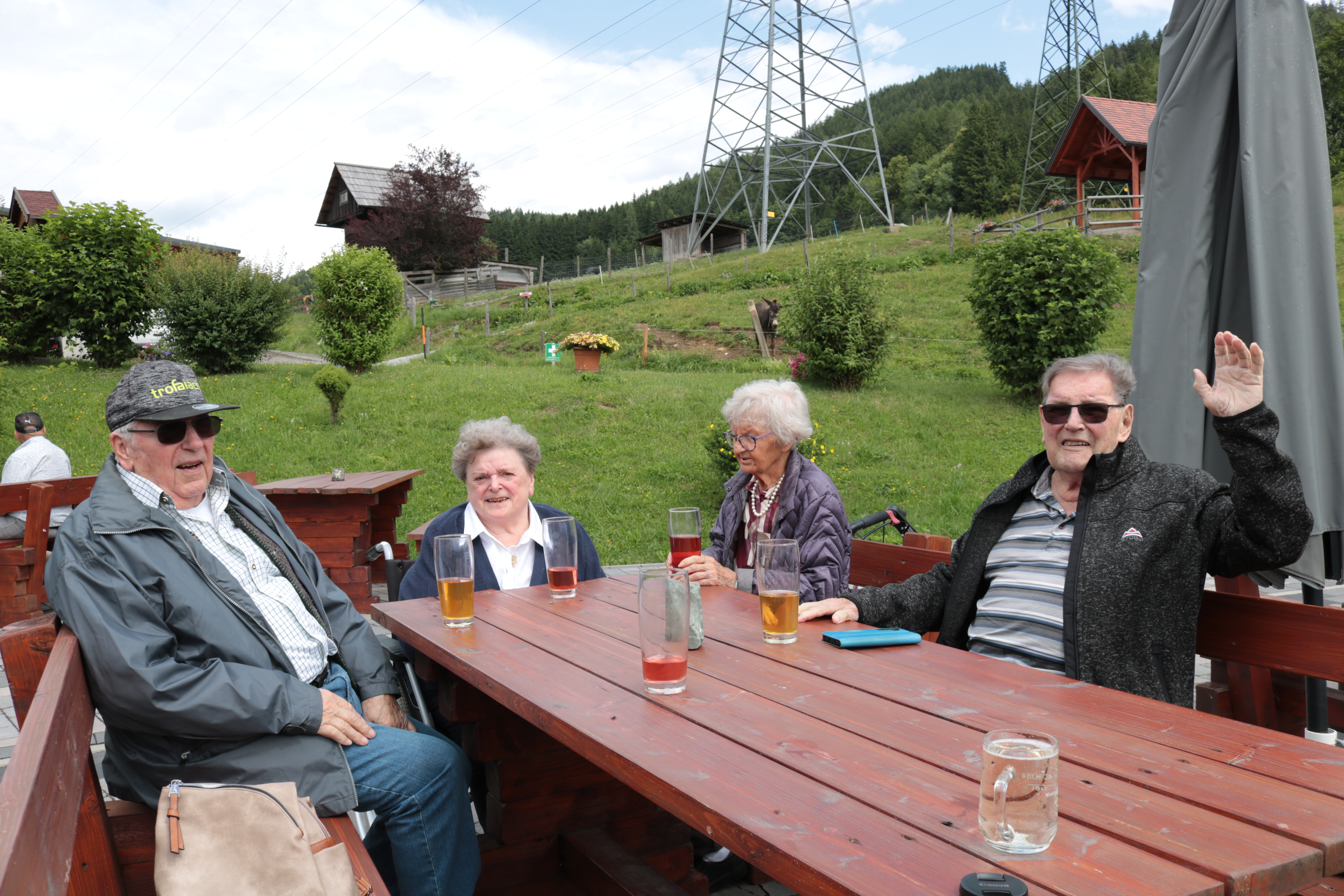 An einem Freitag machte sich eine kleine Gruppe von Bewohner:innen auf zur Buschenschenke Apfelmaier im Tollingraben. Im Tollinggraben angekommen wurden wir schon von den Tieren des Bauernhofes begrüßt. Die Esel stimmten zu einem Willkommensgruß an. Da das Wetter uns nicht sehr hold war mussten wir die Jause in der Gaststube einnehmen. Es gab ein ausgezeichnetes Schweinsbratenbrot und reichlich Most. Ein kleines Schnäpschen durfte für die Verdauung auch nicht fehlen. Kurz vor der Rückfahrt schien die Sonne und wir konnten unsere Getränke auf der Terrasse mit einem wunderschönen Ausblick genießen. Es war ein sehr geselliger Nachmittag beim Apfelmaier im Tollinggraben.
