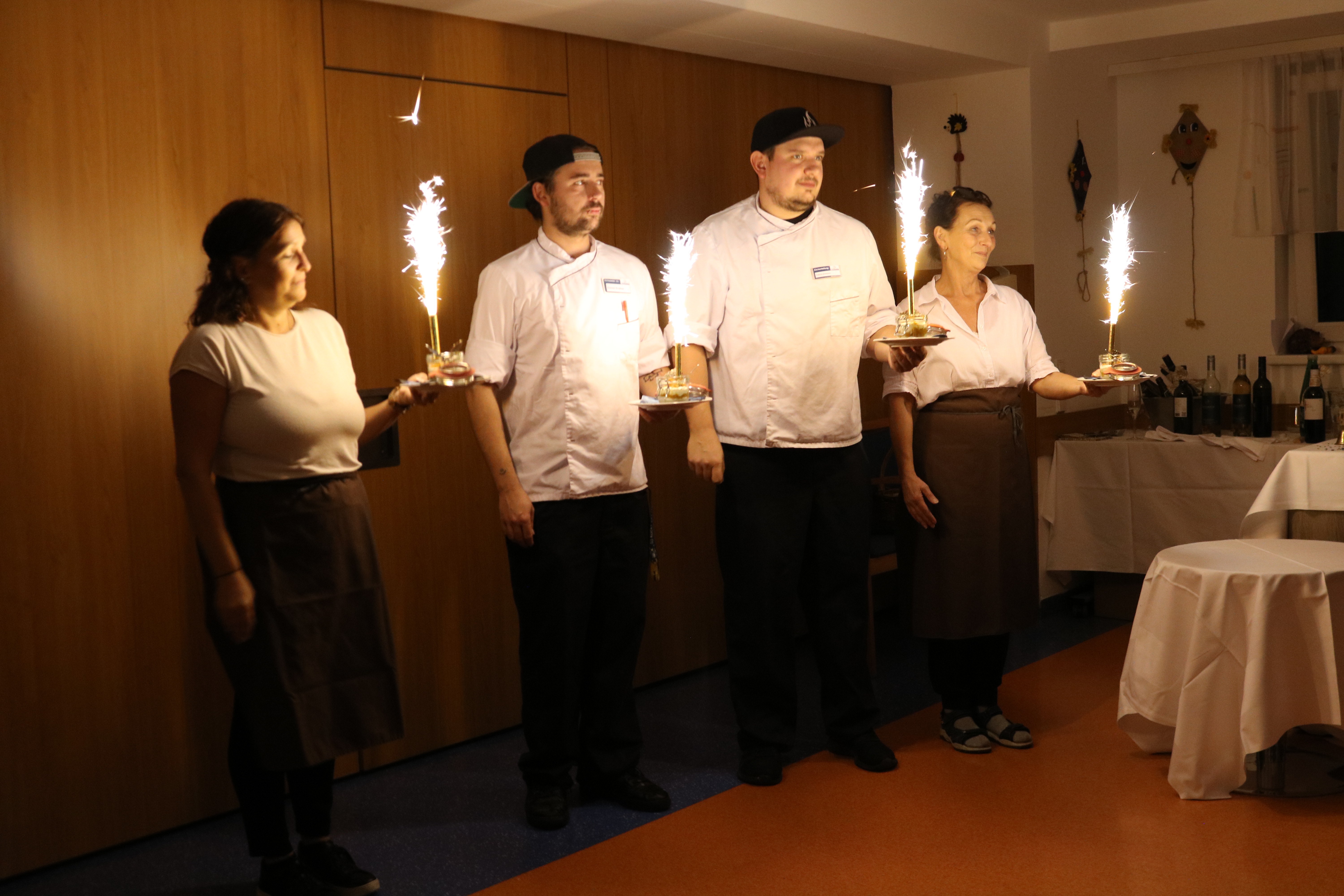 Auch dieses Jahr fand das allseits sehr beliebte „Candlelight Dinner“ im SeneCura Sozialzentrum Trofaiach statt. Die Bewohner:innen hatten die Möglichkeit, ihre Lieben zu diesem Dinner einzuladen. Es wurde von der Seniorenanimation im Speisesaal für ca. 30 Personen ein besonders, gemütliches und einladendes Ambiente geschaffen. Es heißt ja, „das Auge isst bekanntlich mit“ – dies sollte aber nicht nur für die Speisen gelten, sondern auch für die festlich gedeckten Tische. Im Vorfeld wurde von der Verbena Küche an einem außergewöhnlichen und delikaten 5-Gänge Menü getüftelt. Die Gäste waren wieder einmal begeistert von den Kochkünsten des Küchenchefs Patrick Ammann sowie der Sous Chefin Dorian Krainer. Ein delikates Menü braucht natürlich eine erlesene Weinbegleitung – diese wurde von der „Vinothek Prein“ zusammengestellt. Als erprobtes „Service Team“ fungierte die Animation, die trotz später Stunde sichtlich Spaß an dieser Veranstaltung hatte. Hausleitung Stellvertretung Michaela Poschar und Pflegedienstleitung Andrea Ziegerhofer begrüßten die Gäste aufs Herzlichste und nahmen an diesem Dinner mit Freude teil. Als Highlight wurde das Dessert wie auf dem Traumschiff serviert.