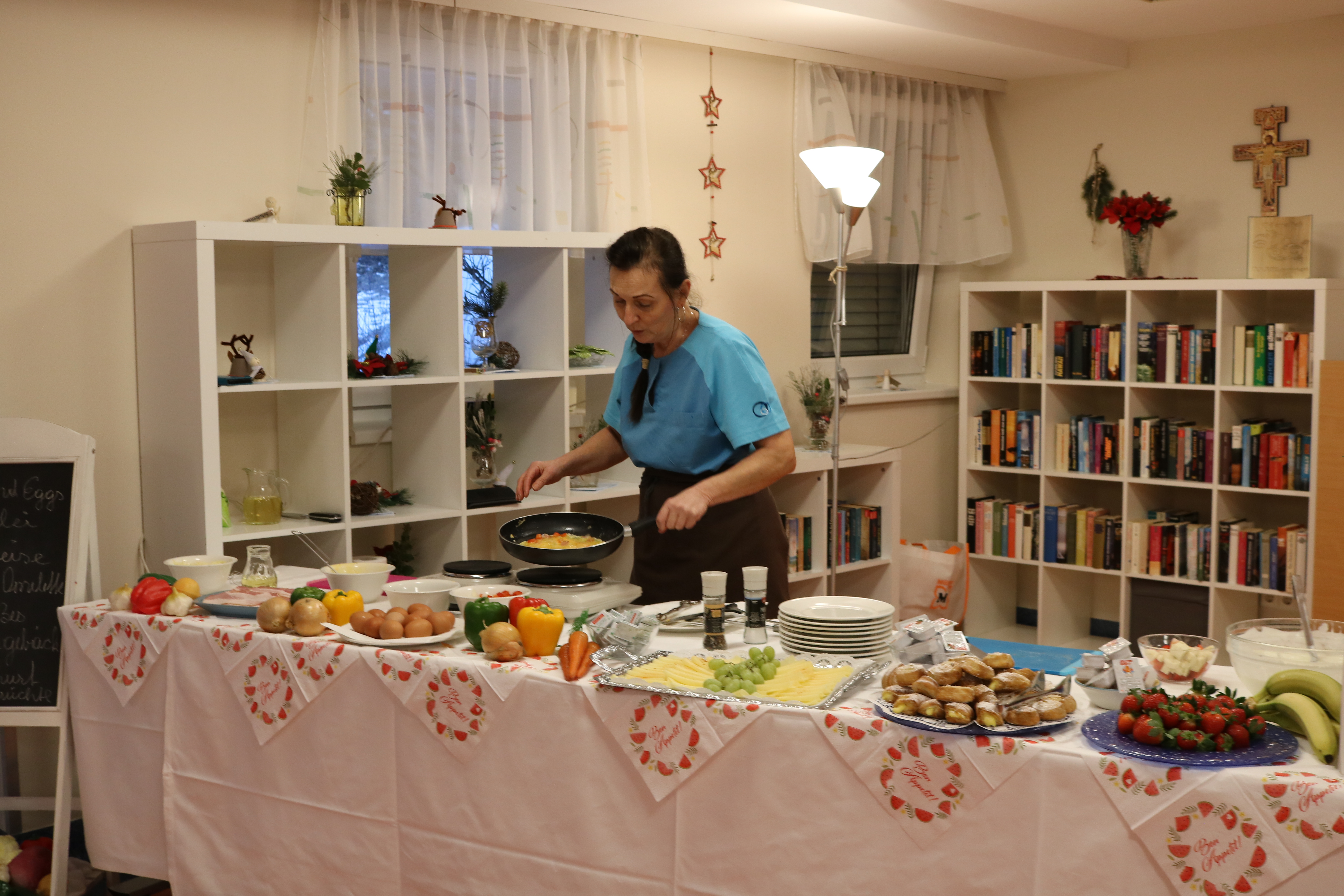 Bei entspannter Musik konnten unsere Senior:innen aus verschiedenen Eier-Variationen wählen. Neben pikantem Omelette, Eierspeise und Spiegelei war „Ham and Eggs“ der große Favorit. Für Naschkatzen gab es Naturjoghurt mit frischen Erdbeeren sowie gefüllte Blätterteigtaschen.